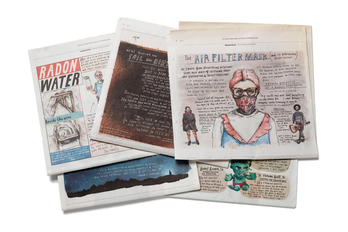 "Meanwhile" was the first column of drawn journalism to appear in The New York Times. Researched, written, drawn, and designed by Wendy MacNaughton, it began as a weekly column in Sunday Business in 2018 and ran for one year. (Then Wendy quit because doing all that was a recipe for burn-out. Sometimes we have to learn things the hard way.)